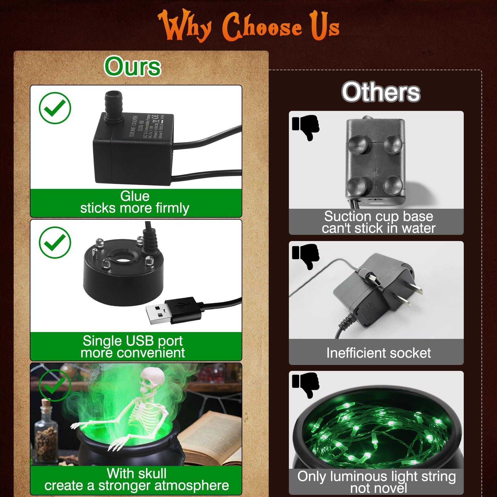 Cauldron + sprayer combo: Adds glowing light and rolling fog for dramatic supernatural vibes.