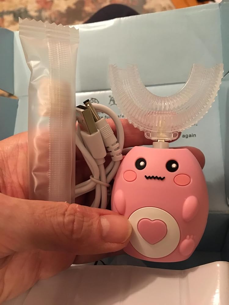 Kid resisting brushing? This seemed like a potential win in that battle...Results, yes my 5 year old was eager to brush her teeth with this. Brush all teeth at once? Even better! My child needed the smaller of the two U shaped brushes, I appreciate that they give you multiple options. This cleans better than a young kiddo brushing independently, but not as well as a grown up helping in my opinion. It comes with a charging cable, it's so simple to use and so far it's working out great for my child. If we have any issues with durability I will update my review. Great affordable fun electric toothbrush option for your little one.