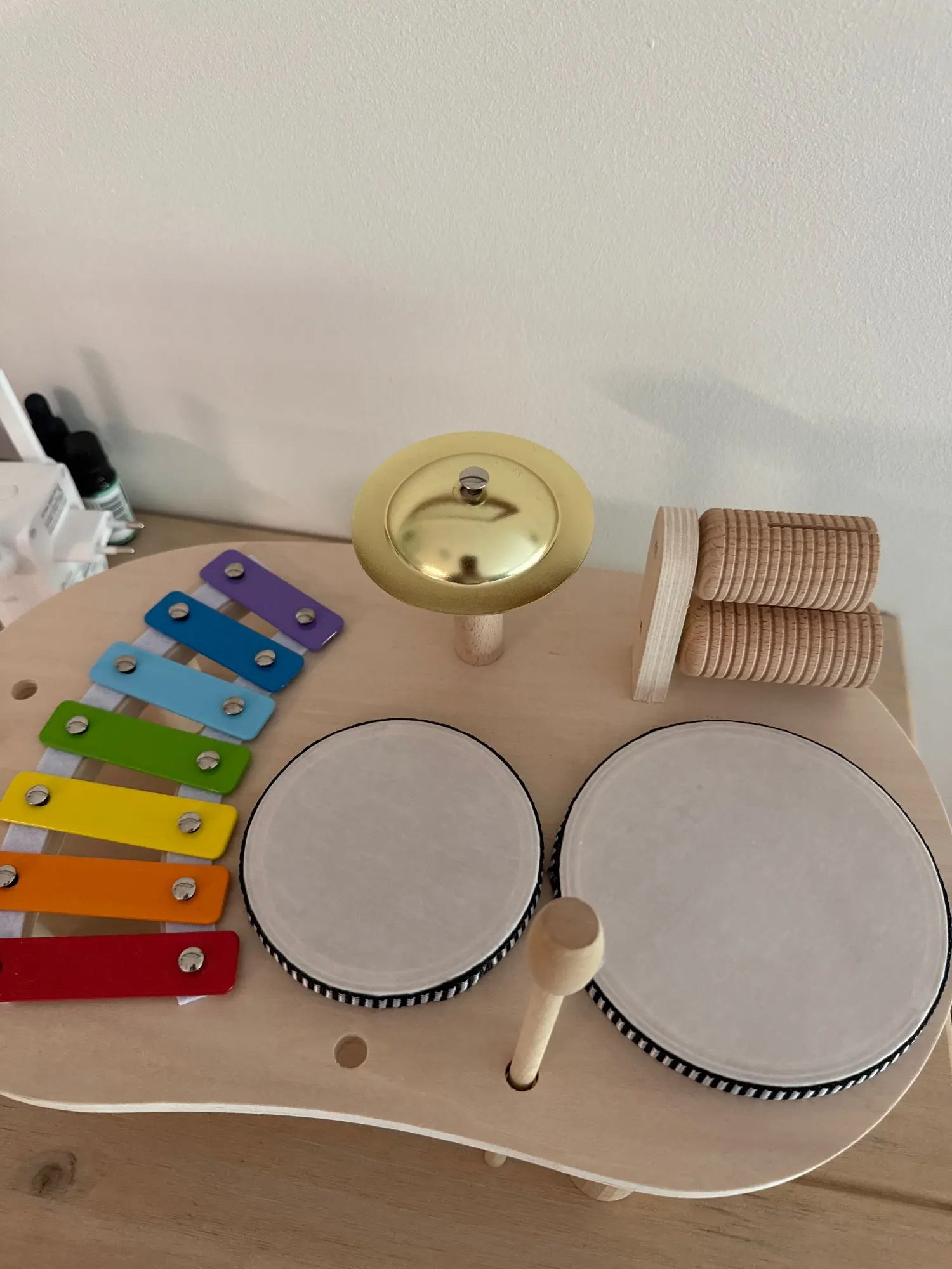 Includes: Wooden drum, brass cymbal, xylophone keys, soft chimes