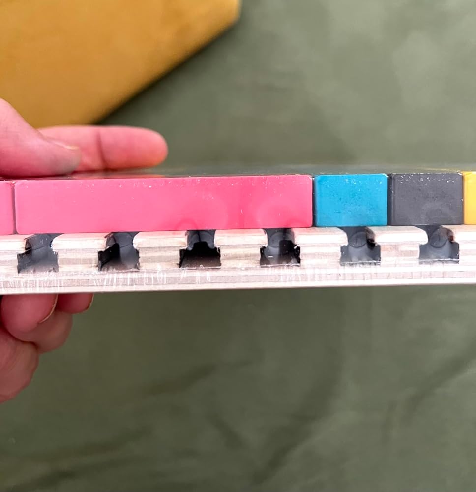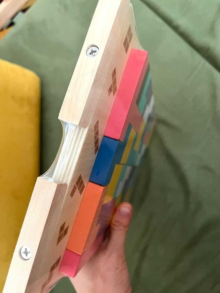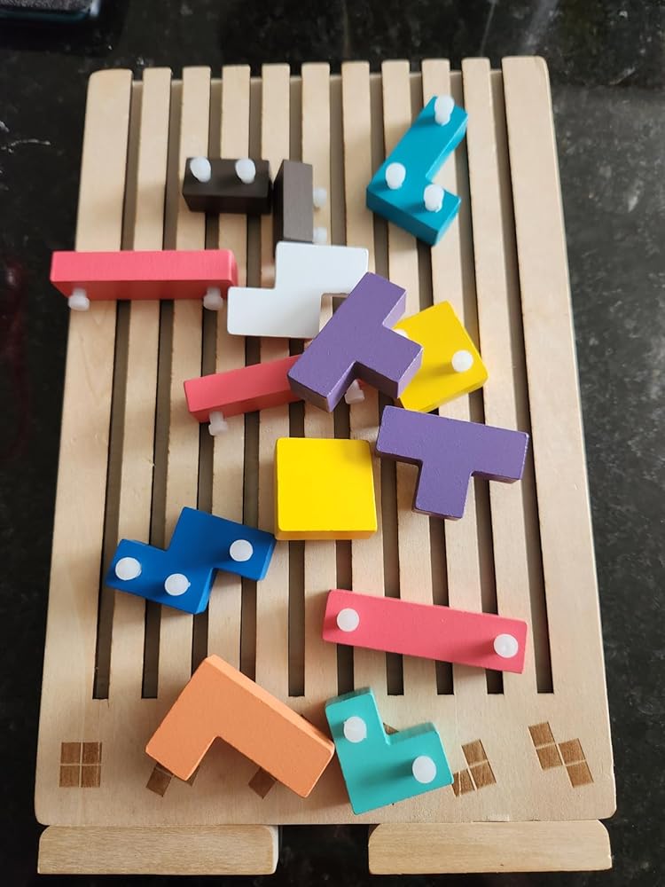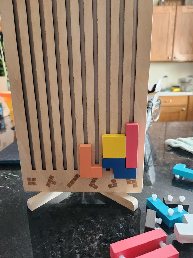 Love the simplicity of this tetris game. Great way to help kiddos with fine motor control and problem solving. Each block is brightly colored and i really appreciate that the pegs in the back are a solid plastic as opposed to wood that splinters. I also really like that the stand is built in and that the whole thing stores flat. (And no, those aren't the only blocks in the pics. My kiddos just weren't sharing. Lol)