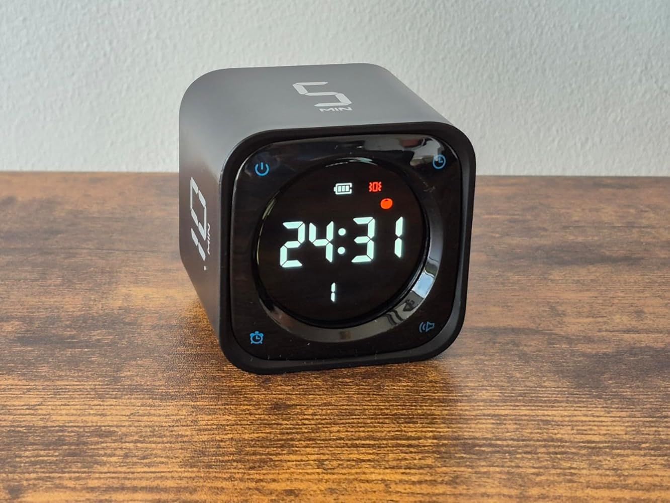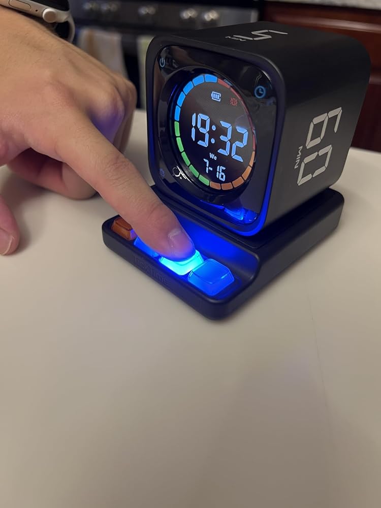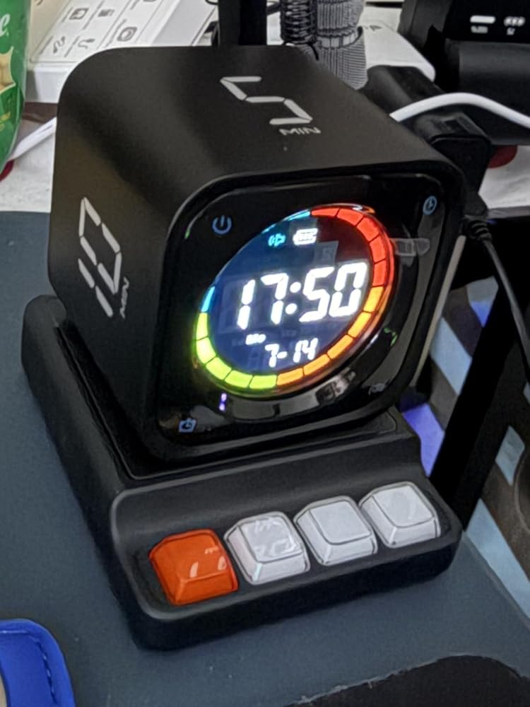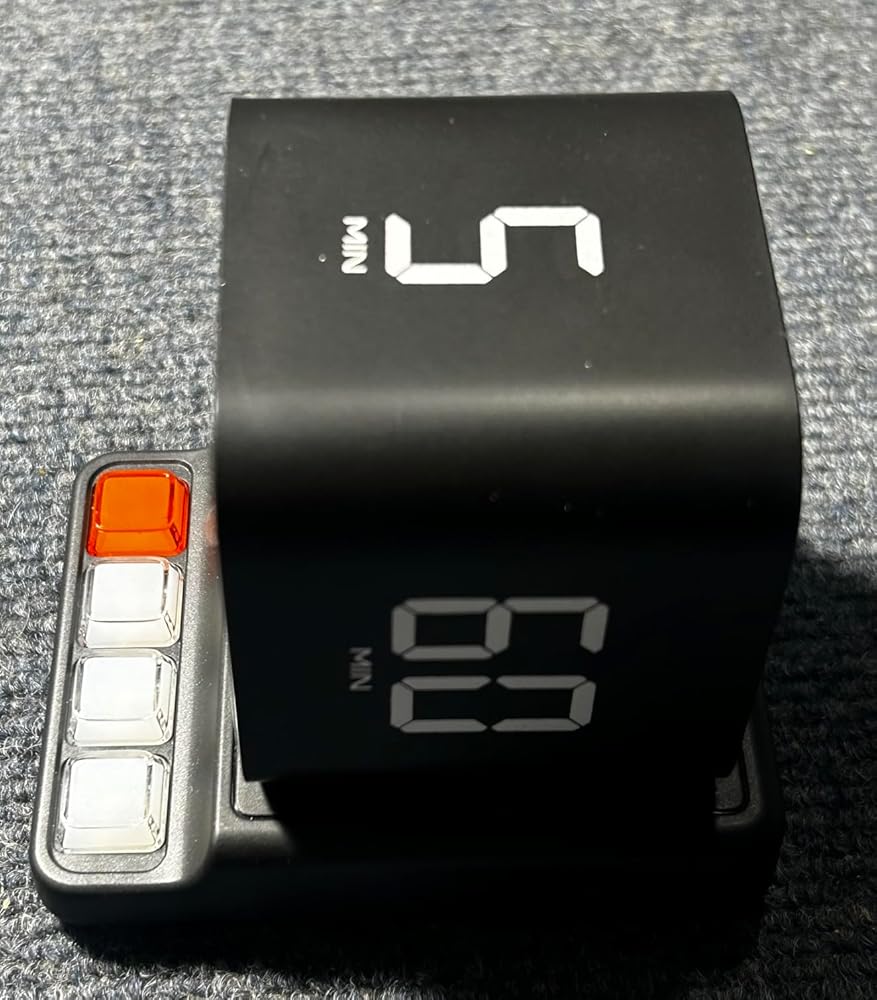 This tiny cube clock timer is such a great design. It is small and compact, and is easy to use and program. Literally the only thing that holds this back is that the clock does not have am/pm designations. It runs on military time. That is such a simple function to have so it is so weird that this does not have it. The dock works well as it is a magnetic charging clip, but the four buttons up front do nothing but light up orange, green, blue, and red. And they make clicking sounds. They are probably there for ASMR effects. But overall it works well and looks great on the desk or countertop.