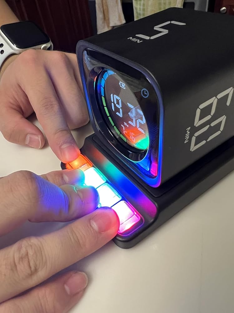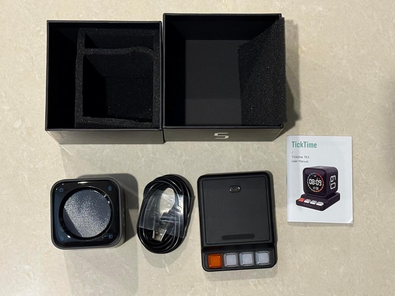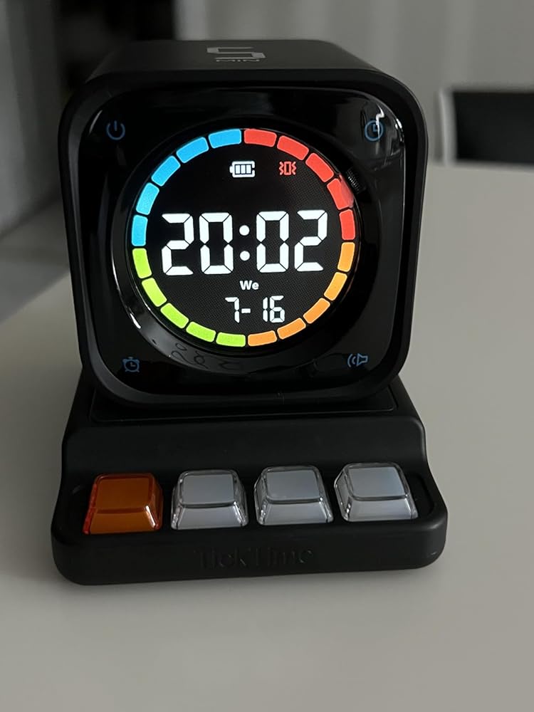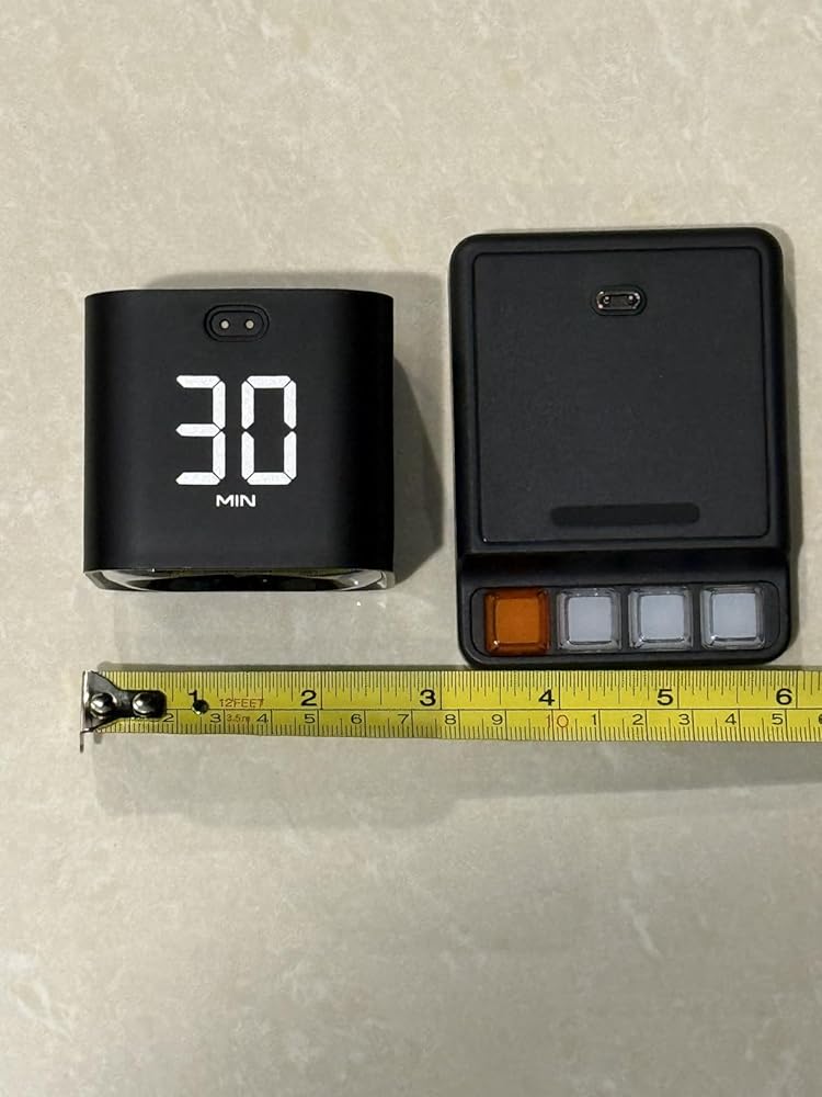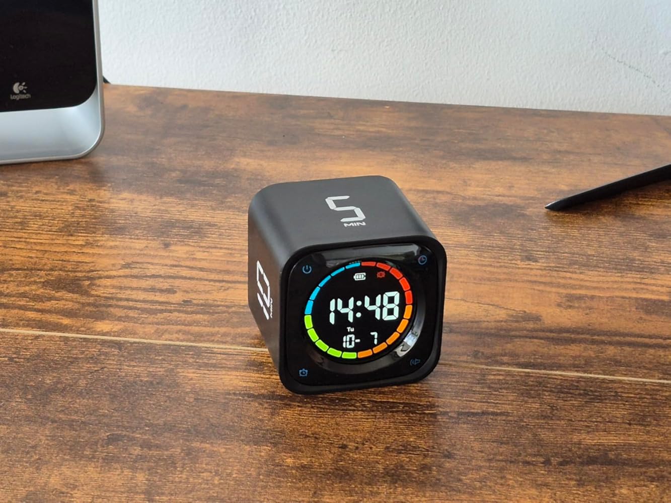 This tiny cube clock timer is such a great design. It is small and compact, and is easy to use and program. Literally the only thing that holds this back is that the clock does not have am/pm designations. It runs on military time. That is such a simple function to have so it is so weird that this does not have it. The dock works well as it is a magnetic charging clip, but the four buttons up front do nothing but light up orange, green, blue, and red. And they make clicking sounds. They are probably there for ASMR effects. But overall it works well and looks great on the desk or countertop.